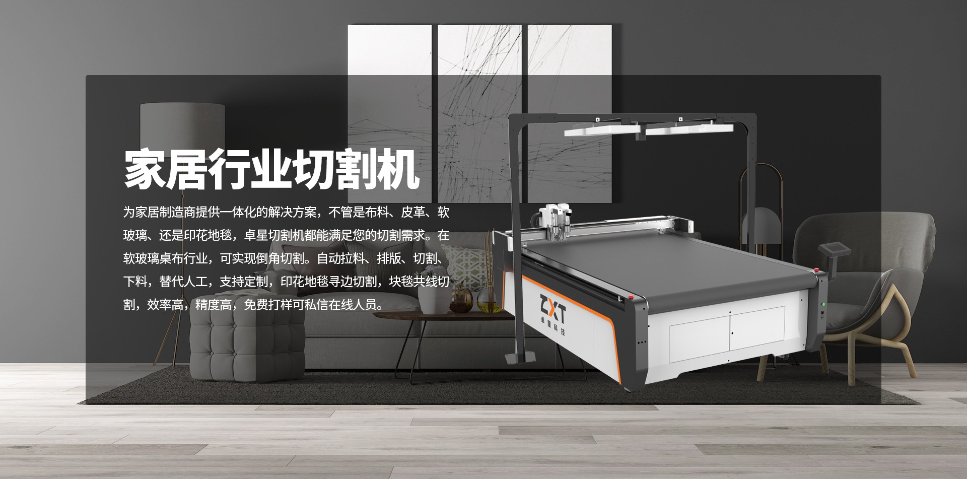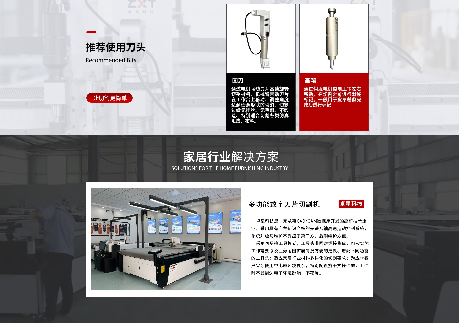 采用可更换工具模式,工具头非固定焊接集成,可按实际工作需要以及业务范围扩展情况方便的更换、增配不同功能的工具头;适应家居行业材料多样化的切割要求;为应对客户实际使用中电磁环境复杂,特别配置抗干扰操作屏,工作时不受周边电子环境影响,不花屏;